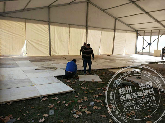 篷房內部配套設施有空調、地板、地毯、布幔、圍幔、燈具;篷房周邊可以做玻璃墻及玻璃門等配套設備租賃。