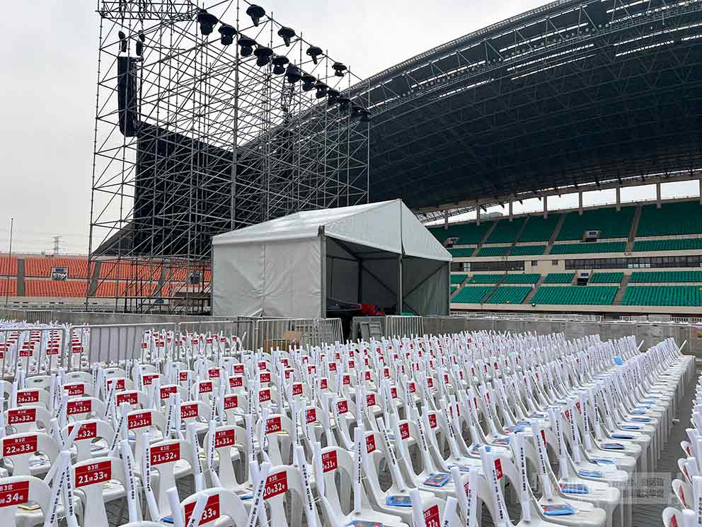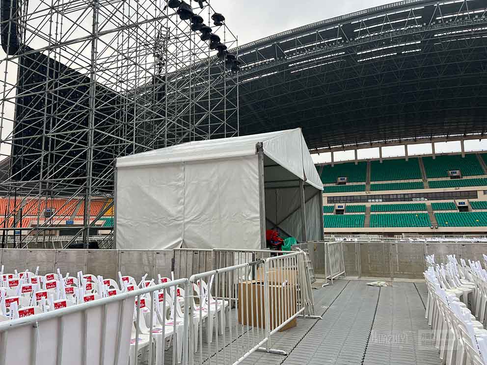 從現(xiàn)場(chǎng)實(shí)拍照片中可以看到,這座演藝篷房氣勢(shì)恢宏,結(jié)構(gòu)穩(wěn)固。篷房外觀采用了現(xiàn)代簡(jiǎn)約的設(shè)計(jì)風(fēng)格,線條流暢,色彩搭配和諧,與演唱會(huì)主題相得益彰。篷房?jī)?nèi)部空間寬敞,能夠容納大量設(shè)備,保護(hù)了設(shè)備不會(huì)因突發(fā)天氣狀況而出現(xiàn)問(wèn)題。
