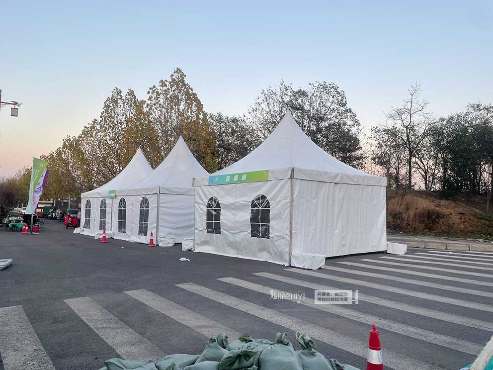 許昌篷房租賃在賽事場地搭建四周無篷布的人字形篷房,形成開放式的核心功能區。這種無側簾設計讓空間通透開闊,既保證空氣流通,又便于人員快速進出,完美適配賽事高強度的流轉需求。針對賽事沿途與場地周邊的服務需求,許昌篷房租賃布置了多座尖頂篷房作為分散式服務站。尖頂篷房的醒目造型成為賽道上的清晰標識,方便選手提前識別補給位置。