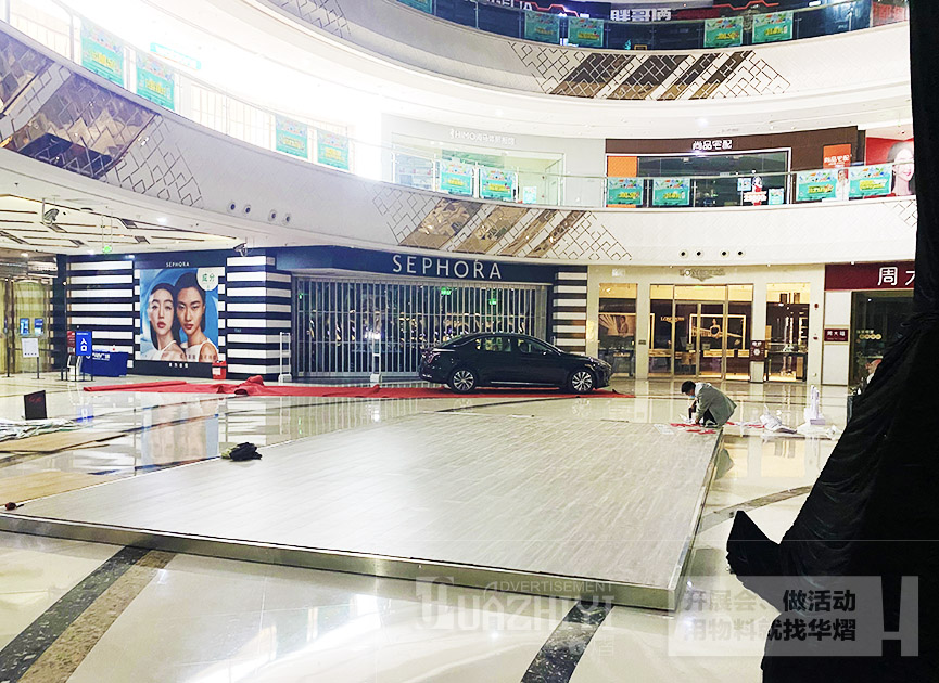 鄭州華熠物料公司二七萬達車展地臺,本次二七萬達的汽車展覽活動所用到的車展地臺是由華熠物料來提供的。本次的地臺搭建從活動的前一天晚上就開始進行了,為的就是商場一開門顧客就能看到我們所推行的汽車,起到很好的品牌效應。