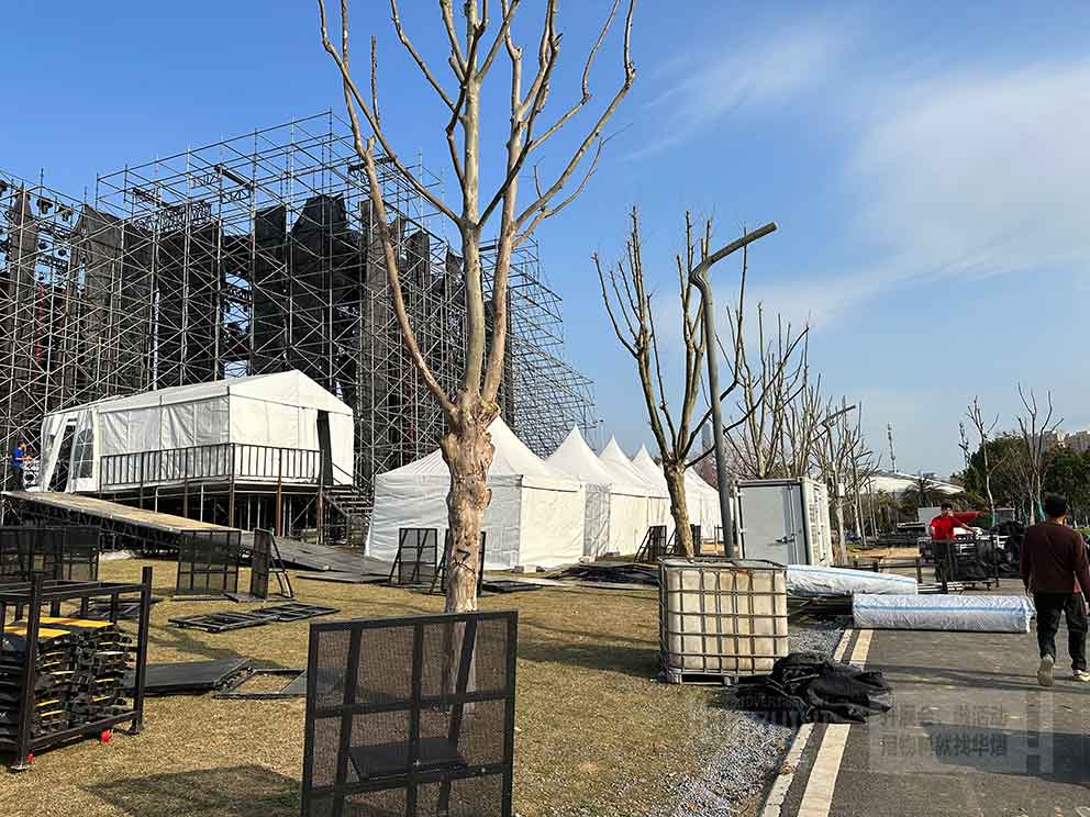 篷房租賃公司搭建游樂園音樂節休息篷房的過程涉及到多個環節,包括篷房選擇、場地準備、搭建過程以及后續維護等。以下是華熠篷房租賃公司對這些環節的詳細解釋: