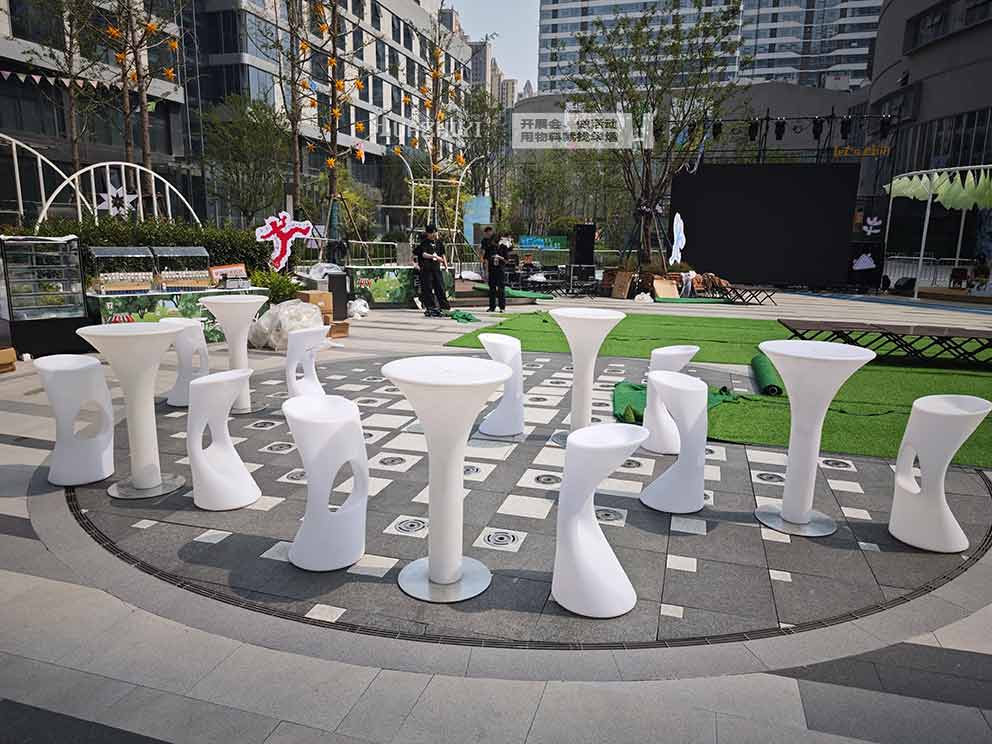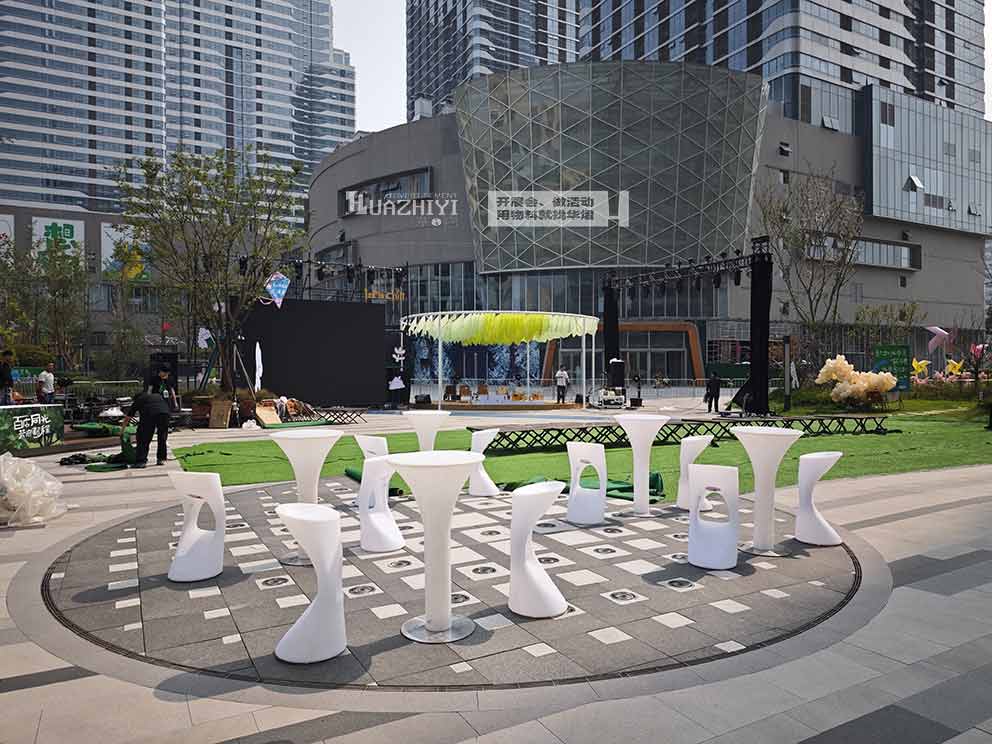 鄭州華熠桌椅租賃公司的師傅們根據7-ELEVEN門前的空間,把發光桌椅擺成圓形。安裝時不用復雜接線,吧桌吧椅自帶可充電電池,按下底座的開關就能點亮,師傅們特意測試了亮度調節功能,確保光線既足夠亮眼又不刺眼,傍晚開燈時剛好能照亮周圍半米的范圍。到了晚上,這些發光桌椅將成為開業活動的“主角”。