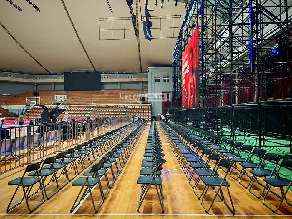 黑色折疊椅的排布藏著對(duì)場(chǎng)景的適配。開封桌椅鐵馬租賃提供的折疊椅采用高密度聚乙烯材質(zhì),黑色椅面搭配銀色金屬支架,單把承重達(dá)150公斤。這些椅子沿場(chǎng)地中軸線呈多排縱向排列,既保證了觀眾的舒適間距,又預(yù)留出清晰的過道。