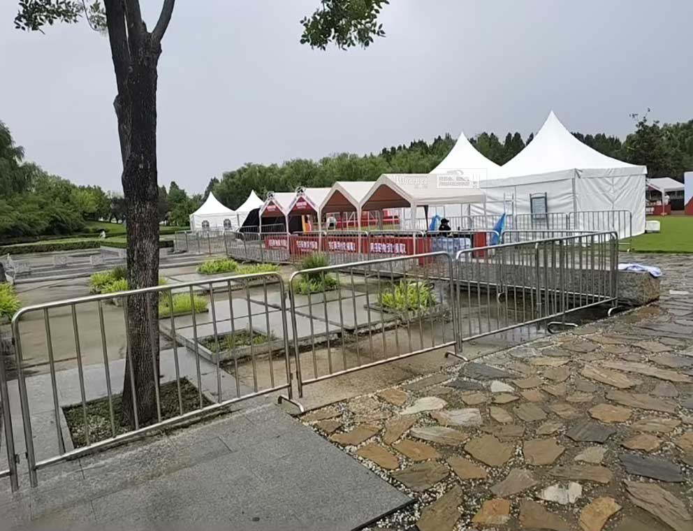 為保障賽事期間的人流秩序與道路安全,洛陽鐵馬帳篷租賃在場地外圍布置了銀色不銹鋼鐵馬護(hù)欄。鐵馬護(hù)欄高度 1.2 米,單段長度 2 米,通過卡扣拼接形成連續(xù)的防護(hù)帶洛陽鐵馬帳篷租賃在布場中,處處考慮賽事的實(shí)際操作需求所有篷房與鐵馬護(hù)欄的布置,都避開了城市交通主干道與行人密集區(qū)域,確保賽事既不影響城市正常秩序,又能讓市民近距離感受賽事氛圍。