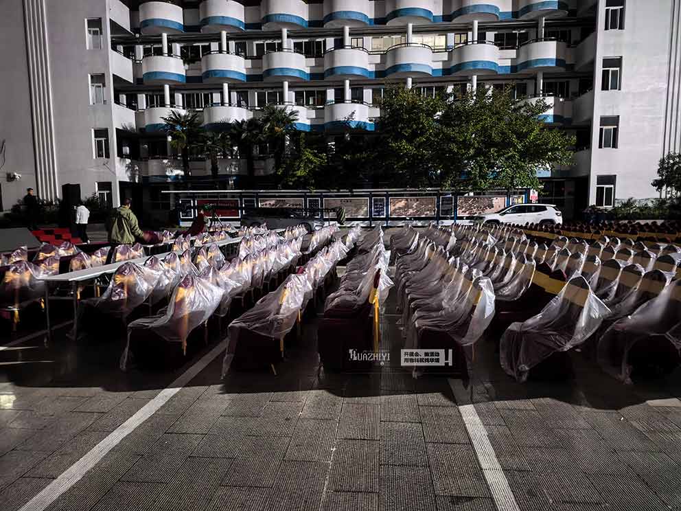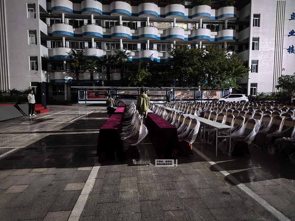 布場(chǎng)安排在校慶開始前一天,天氣預(yù)報(bào)顯示會(huì)下雨,開封桌椅租賃提前制定了周全的防雨預(yù)案。在桌椅組裝排列完成后,團(tuán)隊(duì)迅速為每一把貴賓椅套上定制的透明防雨保護(hù)套,保護(hù)套完全覆蓋椅身。布場(chǎng)過程中,團(tuán)隊(duì)成員分工明確,冒雨高效作業(yè),從桌椅搬運(yùn)、組裝到防雨保護(hù),每一個(gè)環(huán)節(jié)都有條不紊,確保在深夜雨勢(shì)增大前完成全部布場(chǎng)工作,用專業(yè)與擔(dān)當(dāng)應(yīng)對(duì)天氣挑戰(zhàn)。